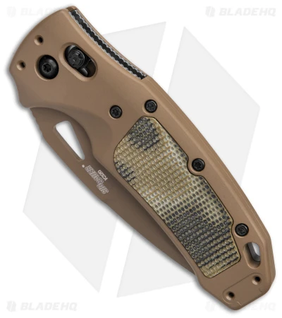 - FDE Cerakote-finished drop point blade made from CPM S30V stainless steel with partial serrations.